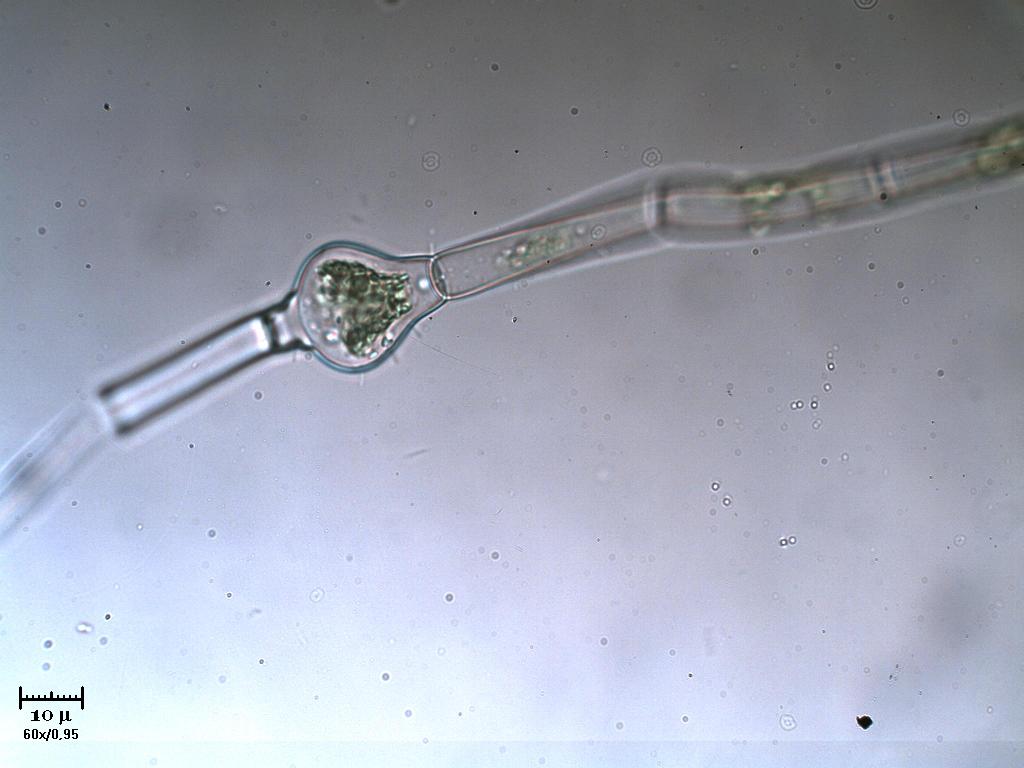 Mi sa che alludi all'eterocisti in una catenella di cellule tondeggianti, tipo collana di perle, per intenderci, nei Cianobatteri del genere Nostoc o Anabaena. La tua però è tutt'altra cosa: è una Clorofita filamentosa, e la cellula tondeggiante è l'oogonio (organo riproduttore femminile). Potrebbe essere un Oedogonium o un Bulbochaete, ma dalla foto non si può dire con certezza.....