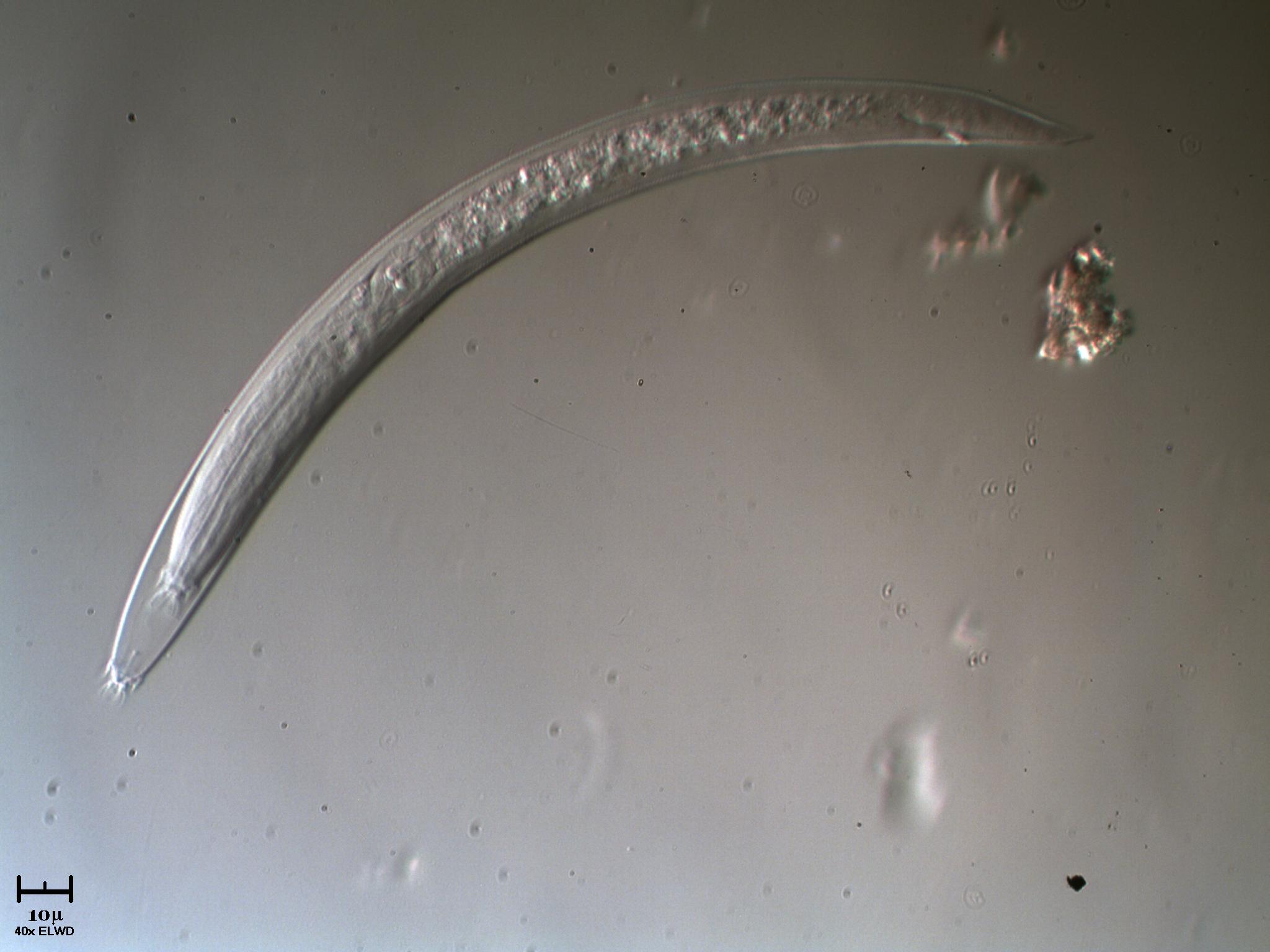 Se non avessi già mandato in stampa il libro (L'acquario segreto, vol. 2) te l'avrei chiesta. Si tratta probabilmente di una larva al terzo stadio che costituisce una forma di resistenza con cui i nematodi possono far fronte ad avverse condizioni ambientali. |