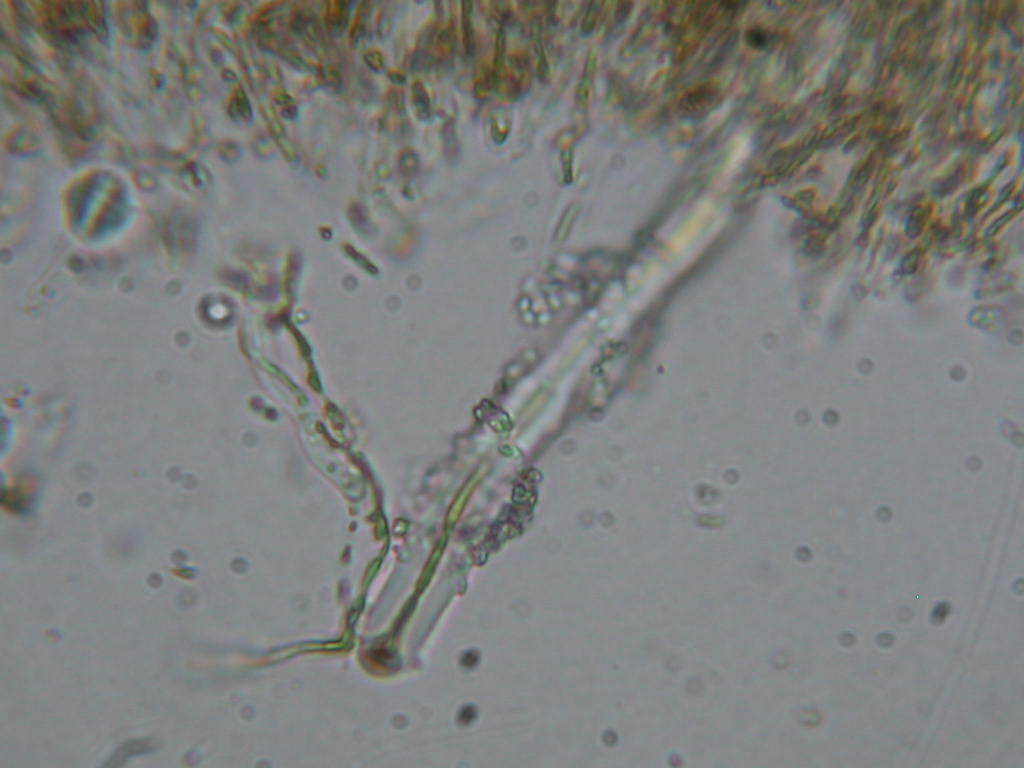 Ces éléments évoquent un peu les tiges d'Equisetum, arvense ou hyemale, par exemple. Dacryobolus karstenii 8641 GT 09212 squelettocystides 1 Immagine: