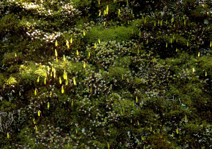 Il muschio sporificato è un Bryum, mentre quello che si vede in secondo piano con il pelo bianco sembra un Racomitrium.