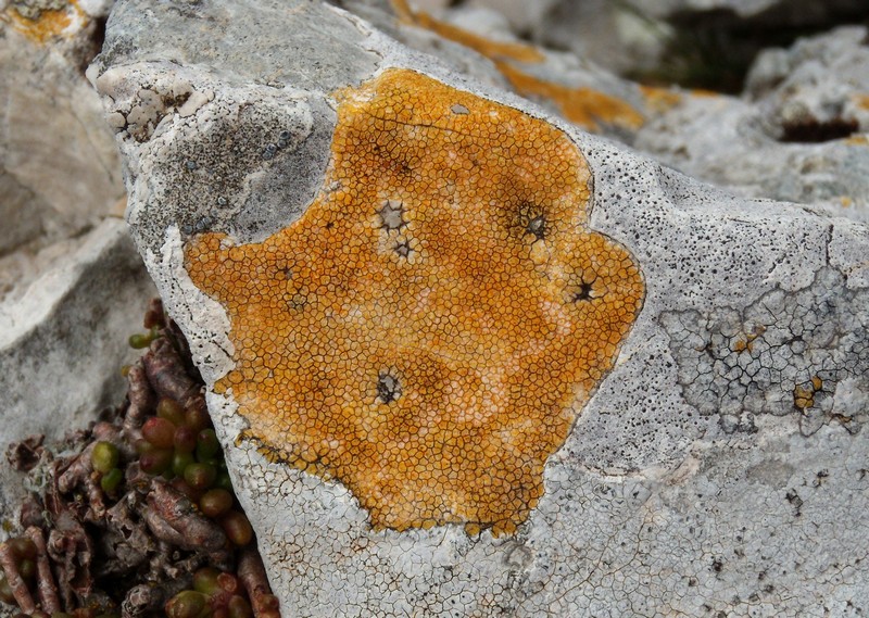 evidentemente questa Caloplaca (sembra proprio la stessa...) ama l'aria di montagna. Qui ci troviamo su un'altra vetta calcarea, il M. Tarino 1961 m, sui M. Simbruini, a poche decine di km dal Navegna. Immagine: