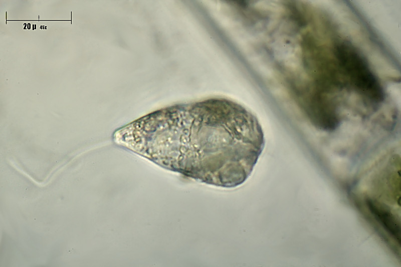 si muoveva sinuosamente con il flagello in avanti e perlustrava minuziosamente una Spirogyra .