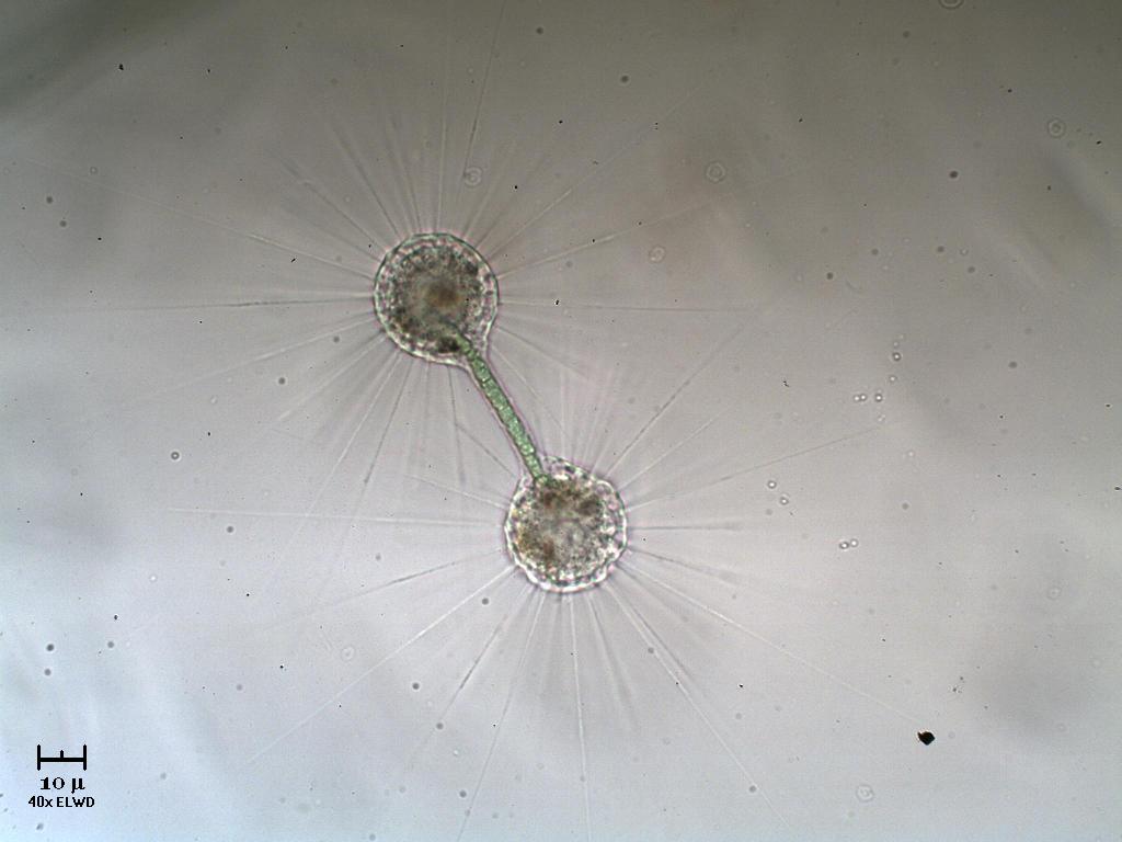 Mi piacerebbe molto avere delle spiegazioni dai nostri valenti biologi sul significato della foto in generale ed in particolare sulla formazione di quel manicotto che si è creato attorno all'alga e che ora mette in contatto i due heliozoi.