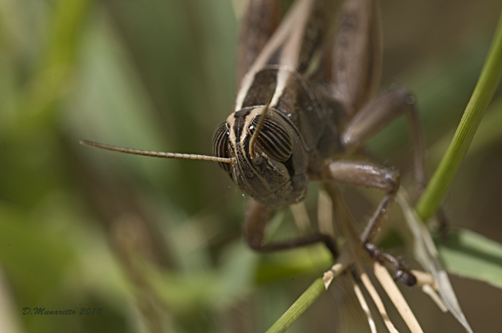 La specie dovrebbe essere Eyprepocnemis plorans; insieme all'Anacridium aegyptium, una delle poche specie con gli occhi a strisce.