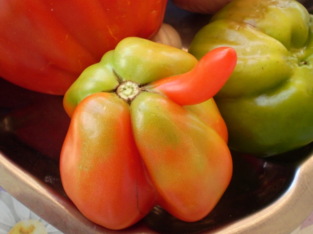 Raccogliendo pomodori nell'orto, ho trovato questo soggetto strano, che ho voluto fotografare (foto 1). Mi sono però accorto che variando la posizione del frutto sulla scena (foto 2, foto 3)l'interpretazione può variare, e non di poco... ...mi caccerete mica per fito***~grafia?