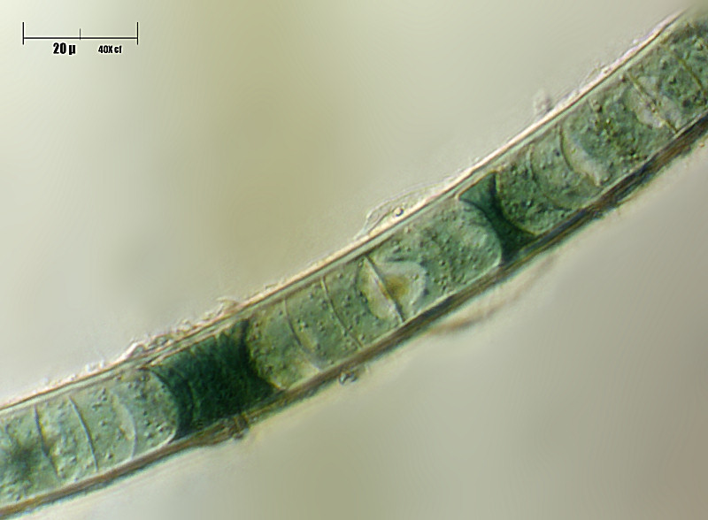 E poi guarda bene i limiti cellulari a livello della teca che avvolge le cellule, come fai a dire che non hanno forma di monete o lenti convesse?! A me sembra proprio quella la forma, con visione laterale è chiaro, e le porzioni a forma di clessidra sono tipiche del taxon. E poi guarda bene le dimensioni, decisamente corrispondenti. Per me è un'Oscillatoriales piuttosto malandata