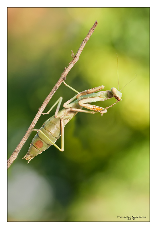 Questa mantide l'ho trovata e fotografata oggi pomeriggio, a prima vista sembra una M. religiosa ma poi guardandola bene si notano dei caratteri somatici che in M. religiosa non ho mai visto come ad esempio quella macchia addominale marroncina che si vede in foto, le ali non coprono completamente l'addome e poi sulle raptatorie non è presente quella macchia circolare nerastra tipica nelle M. religiose......sarà dunque un'altra specie????