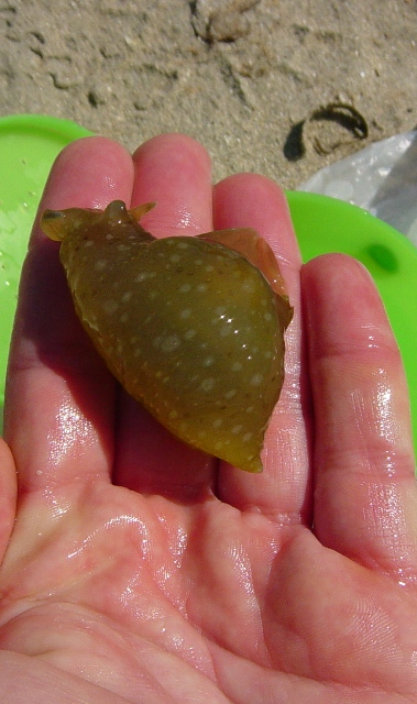 Non avendo una fotocamera subacquea l'ho fotografata sulla mia mano e poi l'ho rimessa in acqua. Credo che il genere sia Aplysia, per la specie che mi dite?