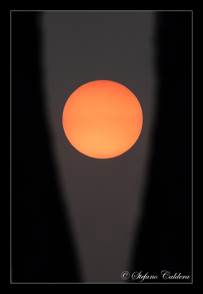 Il sole è pallidissimo proprio perchè è filtrato dalla nebbia/foschia. Sì, senza filtri, sensibilità al minimo e tempo di scatto brevissimo, in modo da evidenziare solo la sagoma. Avendo una 7D inquadro nel display LCD in modalità Live View, anche se pallido evito di guardarlo a occhio nudo (la cosa mi sa che sarebbe da evitare, perchè il live view attivo implica l'otturatore aperto. Però il sole era talmente fioco che, per una foto, ...)
