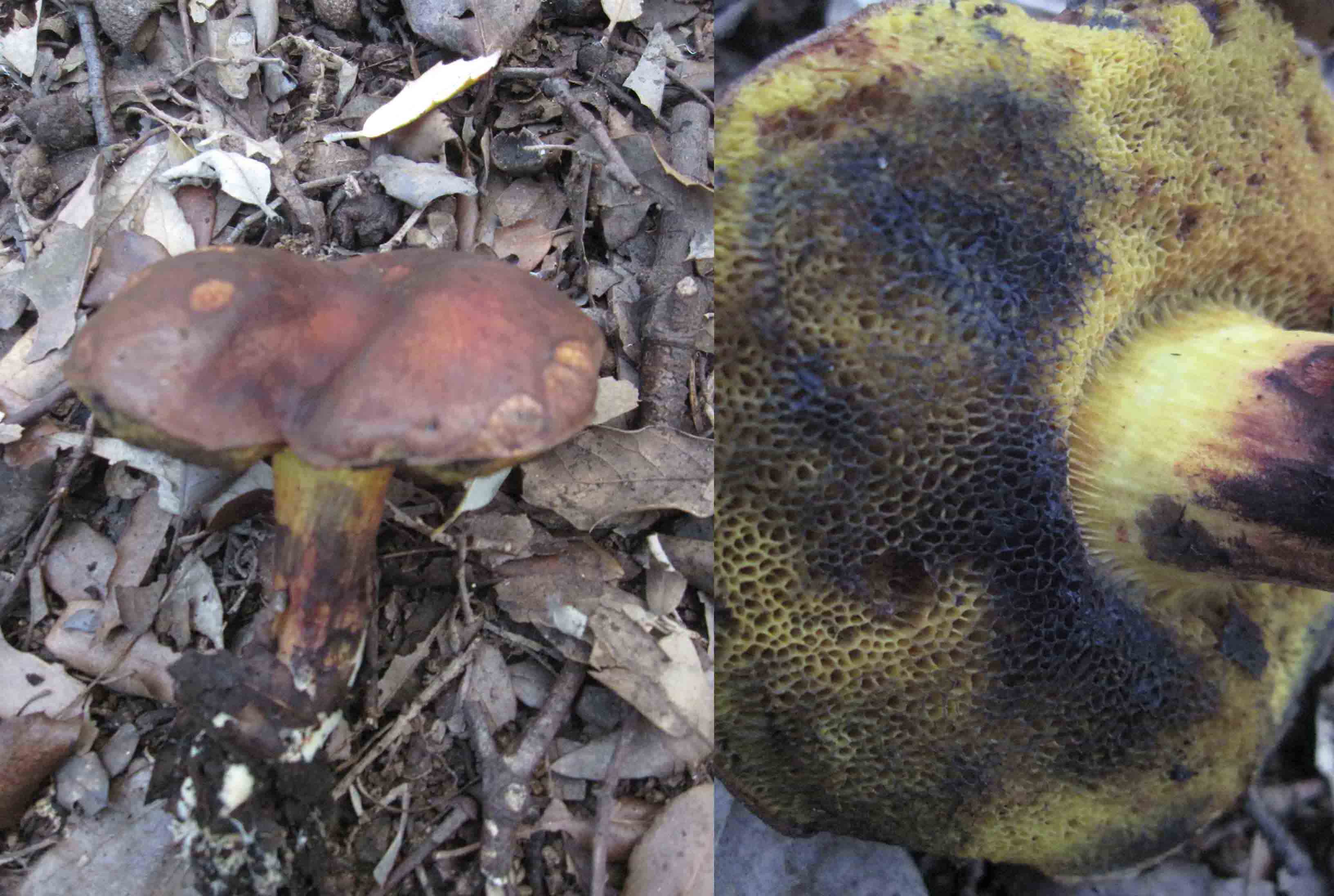 ok per la 2 e la 3. Per la 1 mi sembra di vedere un gambo abbastanza radicante (foto di sinistra), un evidente viraggio dei pori ma anche del gambo al blu-nerastro (foto di destra) oltre la parte apicale del gambo che è di colore giallo vivo. Sarei orientato verso Boletus pulverulentus.
