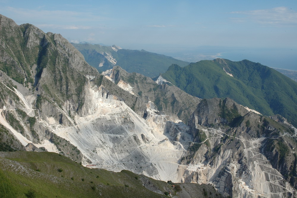 Una veduta di un Bacino Marmifero..di Carrara..fatta da Campocecina..si vedono bene le vie di Lizza (strade a zig e zag)che salgono sui Ravaneti...(detriti di marmo)già impressionanti cosi...ma incredibili quando si vedono mezzi meccanici salire lungo le stesse...Ciao Ivano....