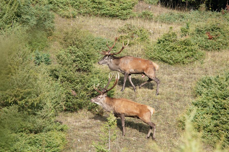 Provocato da bramiti sempre più insistenti che provenivano dalla boscaglia, vi si inoltrò ricomparendo quasi all'istante, interponendo fra i suoi palchi e quelli di un altro cervo i fitti rami di un ginepro.