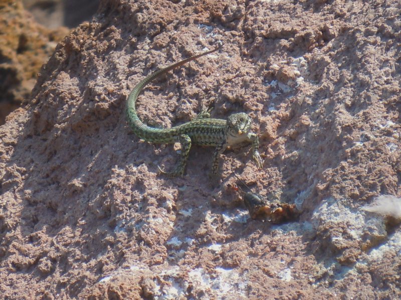 Questa simpatica lucertola tirrenica aveva un..grosso dilemma: continuare ad ingurgitare la gigantesca preda(grillo?)....o controllare da vicino..me, che mi avvicinavo...troppo alla sua roccia con vista falesia a picco sul mare? Alla fine ha optato per entrambe le soluzioni....