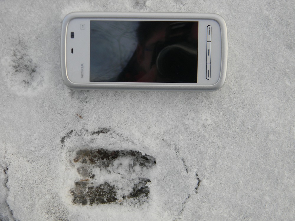 Penso che le possibilità siano due, .... ... questo in conseguenza della poca chiarezza dell'orma (dovuta alla neve) ... e all'impossibilità di visionarla direttamente  Prima ipotesi: nell'impronta si vede il segno di due fettoni (cuscinetti plantari) molto sviluppati ... come evidenziato nella seguente immagine ...
