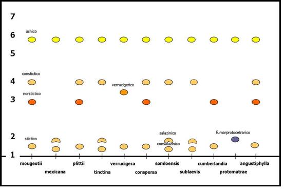 17(16)Presente acido divaricatici come maggior componente..........X. perrugata Presente acido stenosporico come maggior componente..............X. pulla