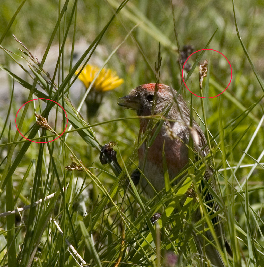 | Quelle con il cerchio rosso non saprei ma quella spichetta che ha l'uccello nella zampa destra mi sembra un Poa pratensis o specie simile, ma mi posso anche sbagliare, parola agli esperti..... |