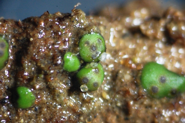Ho trovato questa minuscola epatica tra e sotto i muschi in un terreno sabbioso (Niscemi-CL). Somigliano a "bottoncini" (con rizoidi e di circa 1-2 mm) isolati o in gruppo con due o più macchie bruno-rossicce sulla superficie.