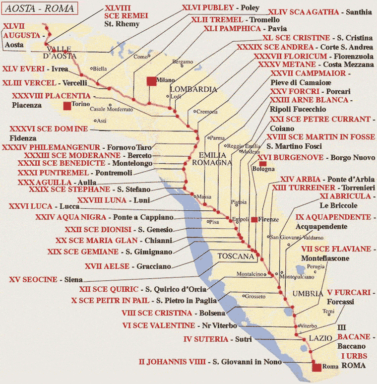 XIX - San Gimignano. S.G. è uno dei punti nevralgici della via Francigena.Lo diventò quando i Medici di Firenze,dopo lunga e sanguinaria lotta,senza esclusione di colpi da ambo le parti,riuscirono a battere Siena ed annettere il suo territorio ai loro possedimenti.Spostarono il percorso dall'Aurelia ,dove l'odiata Volterra vescovile,aveva notevole importanza,sulla Cassia, valorizzando cittadine che da quel momento ebbero un vero e propio bum commerciale;S.Gimignano fu la più importante.