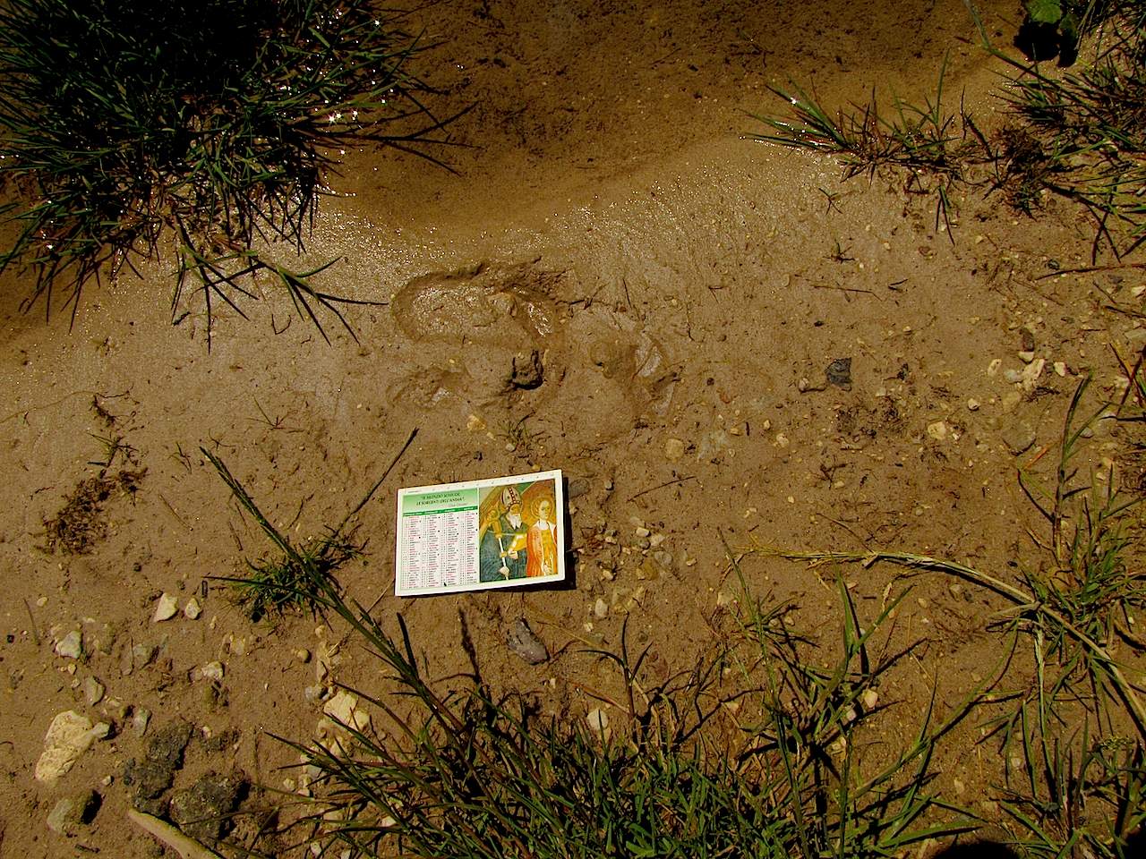 In montagna, la scorsa estate, ho trovato questo strano segno. Era esattamente sulla riva di un torrente, a 1750 m, in Trentino orientale (Dolomiti). Non so nemmeno se fosse un'orma, o magari un segno lasciato da un sassolino spostato dall'acqua, o altro ancora. Secondo voi potrebbe essere un'orma? Nel caso fosse un'orma, la presenza del torrente, da un lato, e di ghiaia, dall'altro, ha impedito l'eventuale formazione di una pista e di altre orme: questo era l'unico segno del genere che ho trovato nei dintorni. Nella zona sono presenti tassi, volpi, scoiattoli, lepri alpine, faine, e forse ermellini (io avevo eventualmente pensato al tasso). Il calendarietto è lungo 10 cm.