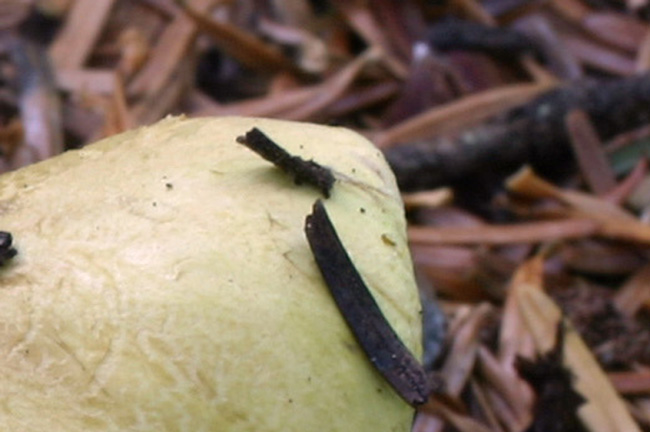 Tricholoma coryphaeum ha lamelle gialline e punteggiature olivastre alla base del gambo ma cresce sotto latifoglia...