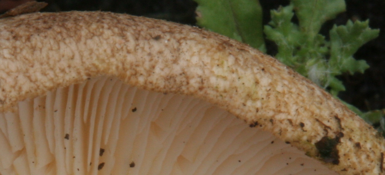 Allora parliamo un po' di Porpoloma spinulosum (che per inciso io ho trovato solo una volta in un solo esemplare, quello ritratto e forse unìaltra volta, una decina di anni fa, durante la mostra di Ceva). In letterature viene dato sotto latifoglie (io l'ho trovato sotto cerro su suolo acido). Appartiene alla famiglia Tricholomataceae e macroscopicamente assomiglia un po' ad un robusto Tricholoma pardinum (o meglio a T.filamentosum). Tuttavia si evidenziano subito alcuni elementi difformi: la presenza di scagliette sul cappello costituenti una sorta di peluria al margine dello stesso, l'odore di agrumi, lo stipite un po' fusiforme e la tenenza di tutto il basidioma ad ingiallire. Microscopicamente sono significative le piccole spore non ornamentate e semi-feriche, e la pileipelli tipo cutis. Non ne conosco le qualità organolettiche (l'ho seccato e depositato al museo)