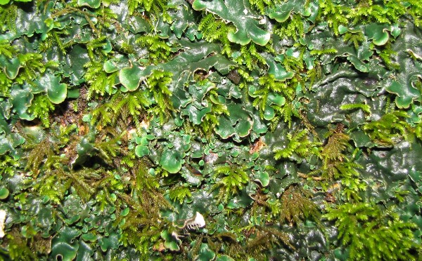 però... è un lichene! non si vedono né i pori, né le aree poligonali delle lunularie o delle marchantie, il tallo sotto non è verde, ma biancastro e le rizine mi ricordano tanto quelle di una Peltigera, anzi diciamo che sembra proprio una Peltigera dal colore molto verde, colore comunque reso difficile da interpretare dal bagnato e, probabilmente, dal flash.
