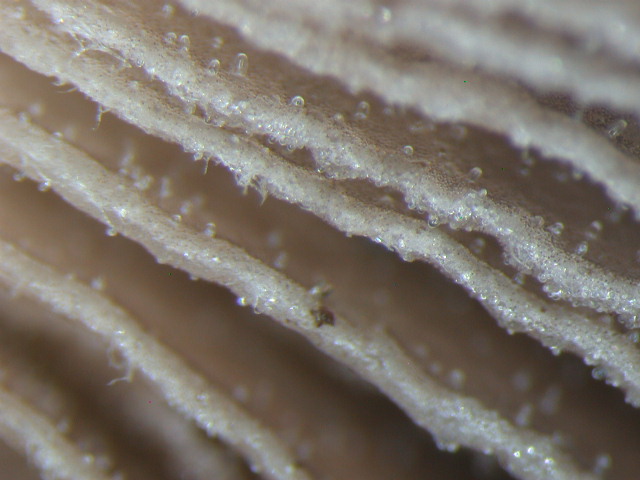 Mycena galopus. Troppa fantasia? Forse si, però quando molto fresca può essudare latice (bianco però) anche dalle lamelle...