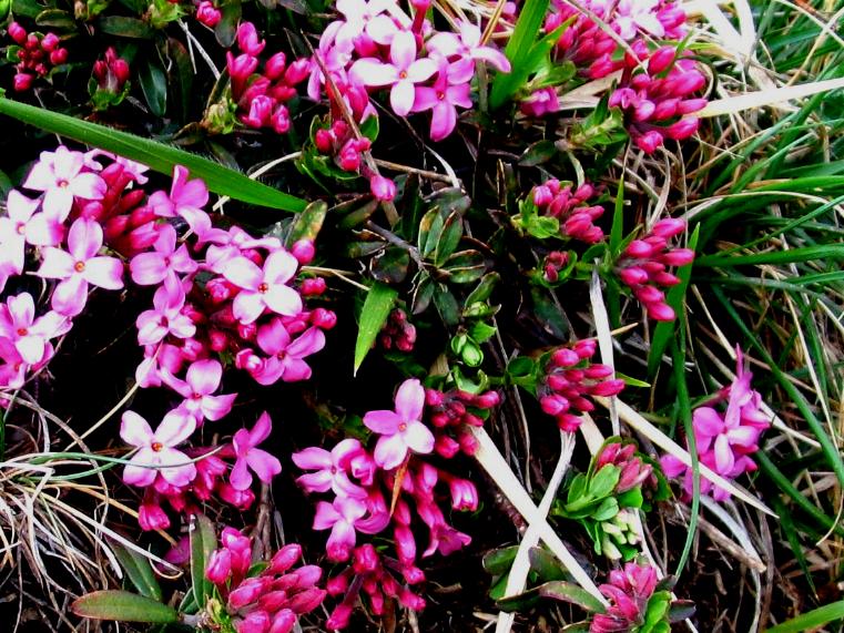 si va per i boschi, o meglio ai margini, tra le rocce di serpentino si vedono questi cuscinetti densi di fiorirosei, ancor prima di avvistarli se ne percepisce l'intenso profumo...è la dafne cneorum il fiore simbolo del Parco Regionale del Beigua