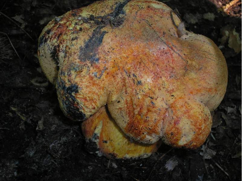 sempre sotto castagno, Boletus luteocupreus, molto consistente con viraggio della carne al blu, reticolo ben evidente, sporato blu-nera