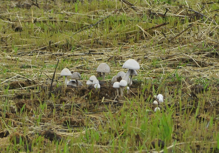 In assenza di specie fungine, nonostante una mia escursione in Corsica e una nel nord Inghilterra, tutte e due senza esiti positivi, non mi è restato che rovistare nell'archivio. Questo è un ritrovamento fatto a fine settembre del 2009 nei pressi di Orbetello, non ricordo se lungo la strada verso il Bosco della Patanella o l'Oasi del WWF. Percorrendo la strada in auto nei pressi di un maneggio di cavalli oltre la recinsione di rete ho notato ad una certa distanza questi funghi bianchi su letame di cavallo, sono riuscita a fotografare solo un tele, non ricordo se sono riuscita a raccoglierne alcuni attraverso le maglie della rete. Le dimensioni del cappello erano di varie misure, da 3-4 cm a 7-8, cappello bianco latte campanulato con leggera sfumatura giallognola al centro negli esemplari più maturi, alcuni presentavano una evidente squamosità, mentre altri erano completamente lisci. Si intravedevano lamelle fitte e grigio-violetto, gambo cilindraceo bianco. Non ho trovato niente in bibliografia che assomigliasse, l'habitat mi porta verso qualche specie di Leucocoprinus sp. (tanto per dire qualcosa) anche se l'aspetto era più da Panaeolus sp., o qualche altra specie non molto conosciuta forse trasportata attraverso qualche foraggio per cavalli...