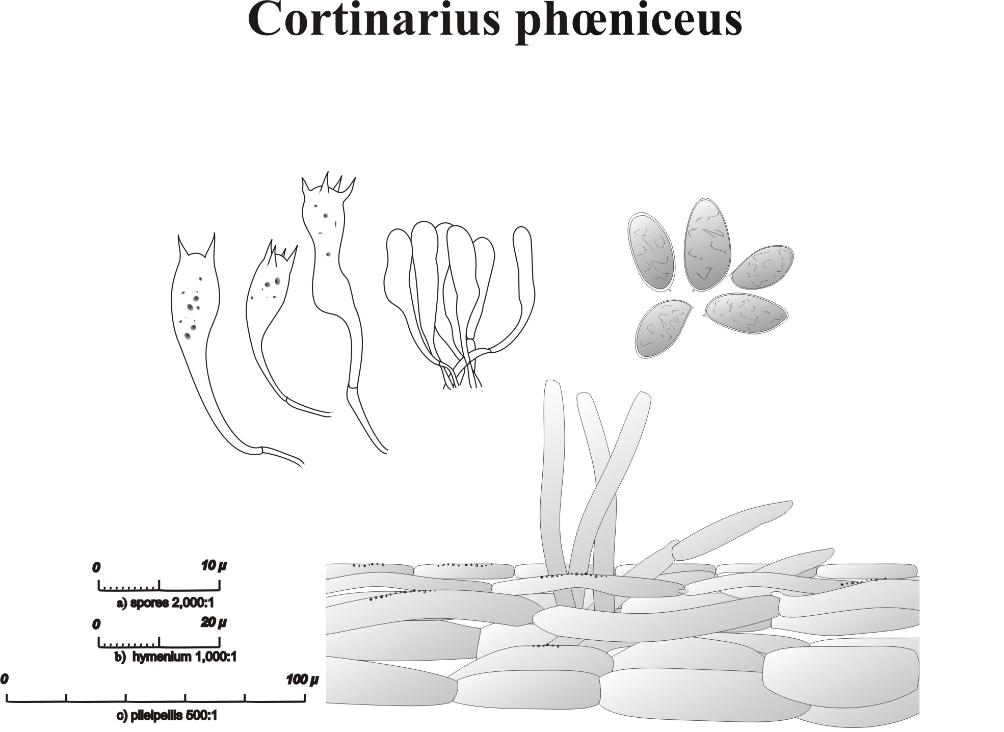 213,47 KBSpecie: C. phoeniceus (Bulliard J.B. 1793 ex Ventenat 1812?) Maire R. 1911 Basionimo: Agaricus phoeniceus Bulliard 1793, Champ. Fr. , Tab. 598-1 ex Ventenat 1812? Sinonimi: Cort. purpureus (Persoon C.H. 1801 : Fries E.M. 1821) ****el L. 1860ss. J.Melot ; Cort. miltinus Fries 1838 ss. Quélet 1872 et 1888, Cooke 1883, Gillot & Lucand 1891, Boudier 1907, // Karsten, Killermann 1928; non ss. Fries 1838 et 1874, Gillet 1874, Saccardo 1887, Ricken 1912 (Derm.)// Agaricus cinnamomeus et semisanguineus Fries 1821 p.p., sec. Pilat, Konrad & Maublanc // Agaricus sanguineus ss. Krombholz 1831, non Fries, // Agaricus semisanguineus var. B;, Secrétan 1833, sec. Pilat, Konrad & Maublanc // Derm. anthracina (Fries) Ricken 1912 ss. Ricken, non Fries, sec. Moser 1974 // Cort. cinnamomeus Fries 1874 p.p., sec. Konrad & Maublanc // Derm. sanguinea (Wulfen : Fries) Wünsche 1877 var. vitiosa Moser 1976 sec. Hoiland 1983 Data raccolta 13.19.2001 Legit: ignoto (reperito durante la mostra micologica di Sezana (SLO) Note di raccolta Habitat: presumibilmente sotto faggio (dai resti sul cappello e base del gambo). Denotare che l’ecologia di questo fungo è prevalentemente confinata a zone umifere e muscose di aghifoglie,tuttavia escresce –come pare in questo caso – anche sotto faggio, carpino e quercia. Habitus: robusto da Dermocybe rossa. Cappello: Æ < 32 mm subgloboso a convesso, cuticola liscia asciutta, lievemente igrofana di un bel colore rosso carminio con fibrille innate, rosso-nerastre, margine involuto, permanentemente rosa ciliegia. Lamelle: abbastanza fitte, ca. 49 al gambo, alte 5 mm, annesse, ondulate, con il margine liscio di colore rosso sangue, poi rosso nerastro, margine ancora rosso sangue Gambo: robusto, un po’ ricurvo, lungo7 cm. x 8 mm., base lievemente ingrossata < 13 mm, colore di fondo giallo aranciato, sovrapposto dalle fibrille rosso carminio del velo Carne: soda e compatta biancastra con sfumature rosate ciliegia Odore: on po’ rafanoide, Gusto: lievemente amaro Reaz. Chim. Spore: ellittiche finemente punteggiate 5,9 – 7 (-7,8) x (2,9-) 3,3 – 4 (-4,9):ind. 1,5 - 2 #956;m. Imenio: filo parzialmente fertile con basidi cilindracei, bi o tetrasporici 25 – 33 x 6 –7 #956;m. Numerosissime le cellule sterili cilindriche o subclavate o vescicolose 15 – 22 µm.. Pileipellis: ife cilindriche, parallele o lievement intrecciate x 5 –10 µm con giunti a fibbia e talvolta con un contenuto vacuolare rosso. Ife terminali con testa arrotondata o sub-lanceolata. Ipodermio quasi indistinto, ma ife piùellissoidali z 20µm. Presenza di incrostazioni sulle ife superficiali. Ife tromboplere presenti con un contenuto oleoso giallognolo.