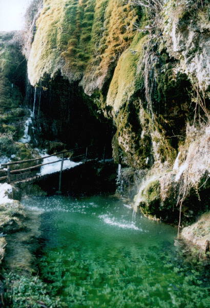 Piccola grotta tufacea con sovrastante cascatatella, incastonata nel bellissimo paesaggio dell'Appennino Bolognese.