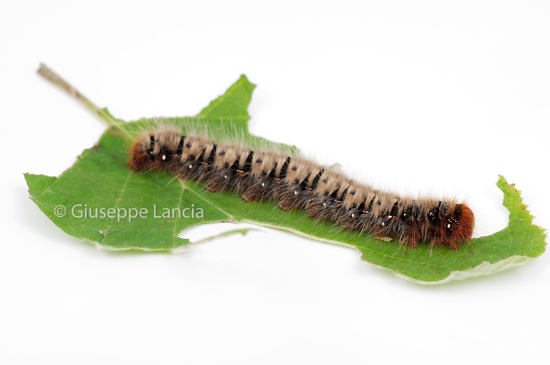 Buongiorno, sono un nuovo utente, Giuseppe Lancia, fotografo stock. Spesso cammino nei boschi e sabato scorso ho trovato, intorno il lago Albano (Lazio), un bruco peloso, lunghezza 5cm, larghezza circa 8mm. L'ho trovato su foglia di mora, ma pare non cibarsene. Preferisce foglie di nocciolo, ma non disdegna neanche quelle di melo, se non ha le prime.