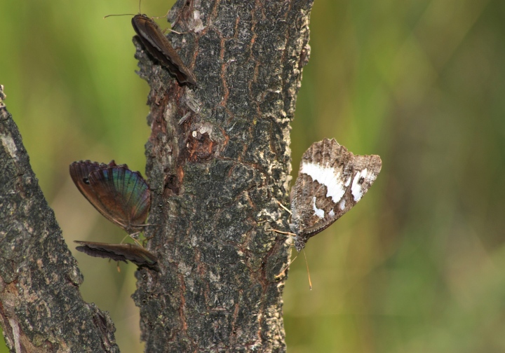 Documento di nuovo lo strano fenomeno delle farfalle che si raggruppano a succhiare la linfa zuccherina degli alberi dalla corteccia , ogni mese un tipo diverso.Sono partito a fotografare N.polychloros,A.ilia e B.circe ed ora a luglio gruppi di Minois dryas, Vanessa c album e Brintesia circe.