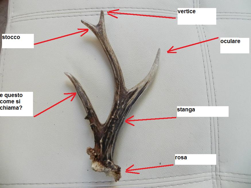 Non sono d'accordo; lo stocco è di norma sempre più in alto dell'oculare (più vicino al vertice) ... spesso (soprattutto negli animali giovani) è molto vicino al vertice; il fatto che si tratti di un animale giovane è supportato dalla forma del sigillo ... decisamente convesso. Credo quindi che i nomi dati da Gianni siano corretti ... e quella indicata come sconosciuta sia effettivamente una "punta aggiuntiva" ... che come tale non ha nome; ... mi viene anzi da pensare che potrabbe trattarsi di una "stanga aggiuntiva" ... perchè mi pare origini dalla rosa.