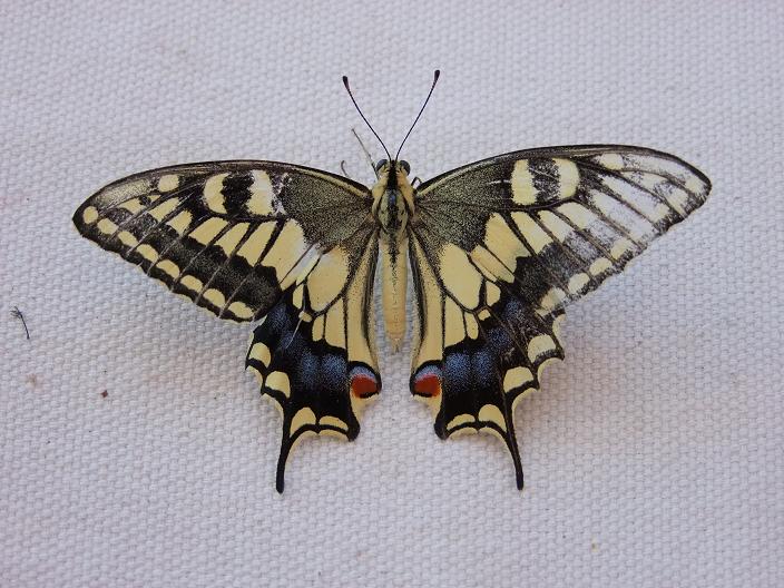 La porzione pigmentata scura delle ali posteriori è molto più ampia di quella dei nostri macaoni (almeno di quelli che vedo di solito), e anche il disegno mi sembra molto diverso. Nei nostri il disegno scuro è poco più di una bordatura, mentre qua l'area pigmentata interessa una porzione importante dell'ala posteriore.