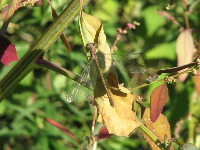 La libellula è molto piccola, come si vede in rapporto alle infiorescenze di Chenopodium album su cui si trova.