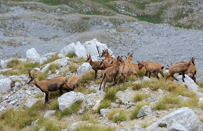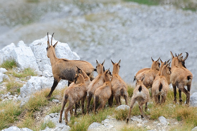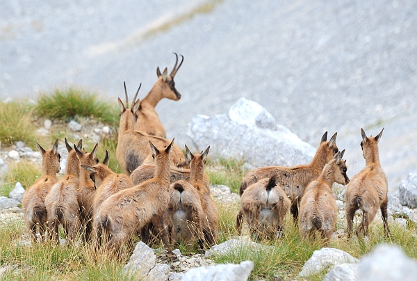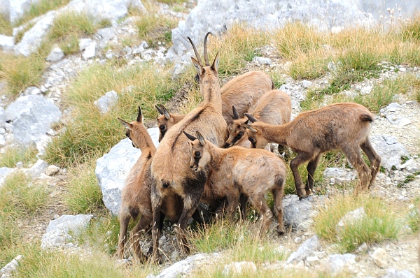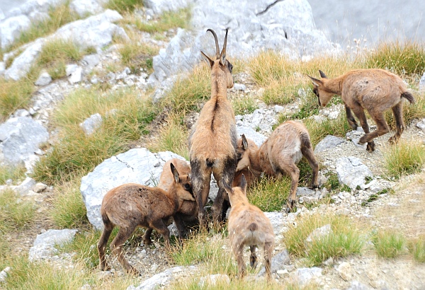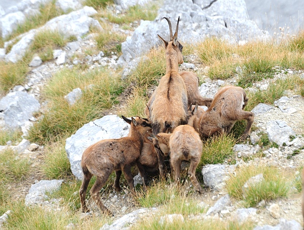 Stranamente anche lo scorso anno, se la memoria non mi inganna, documentai un tentativo di allattamento contemporaneo da parte di sette camoscetti, tanti quanti questi. Immagine: