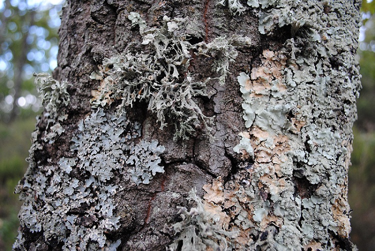 Quello a sinistra e bene Parmelia sulcata. Con ingradimento si vede bene i pseudocifele (fessure bianche = frattura del cortex superior con apparizione della medula bianca). Questo non appare niente da Flavoparmelia caperata che presente anche un tallo molto più spesso di colore verde-giallastro.