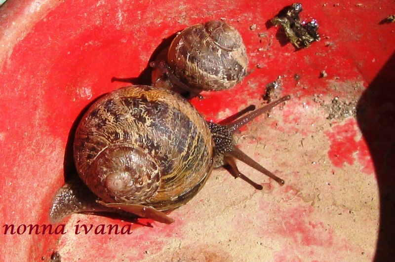 Mi accomodo in questa sezione per un motivo semplice, sono molto ignorante, sono poco tecnica, uso la macchinetta digitale solo come supporto della memoria, memoria emotiva, e come mezzo di comunicazione dimostrativa! Come per una ricetta faccio il passo passo fotografico, per tirare poi le fila per redarre il testo a posteriori, anche per l'approccio con altri eventi, piccoli o grandi del mio quotidiano. utilizzo l'immagine...per parlare! Ai primi di maggio cercavo di ripulire lo spazio intricato accanto al muretto e, in mezzo alla pacciamtura di fogliame putrefatto mi sono trovata una ciotola di terracotta, residuato dei lavoretti che fanno i bambini alla materna, finita lì chissà da quanto! E che ci vedo all'interno? Due chiocciole...vincendo il moto di repulsione che provo per questi animaletti così voraci del mio sedum spectabile brilliant , mi sono sistemata la ciotola sul tavolino e ho seguito questa pantomina
