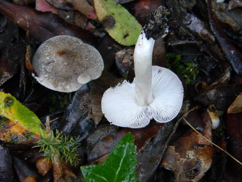 Nella prima foto, fra i due Tricholomi, si vede un fungettino che mi sembra una Mycena. Nel primo Lactarius io vedo lattice candido, senza accenno di sfumature gialle; a meno che non ne abbia avuto il tempo.