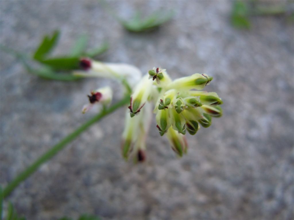 In questo caso abbiamo due specie. La fumaria a fiori bianchi, pur non vedendo i caratteri diacrtici, la chiamere Fumaria cfr. flabellata (peduncoli riflessi alla fruttificazione, sepali non più larghi della corolla) mentre quella a fiori rosa mi ricorda Fumaria bastardii. Ovviamente non si può essere più precisi al momento.
