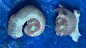 Detrito da Scilla, 2011, -50 m. La larghezza massima dell'esemplare a sx della foto è di 1.4 mm.
