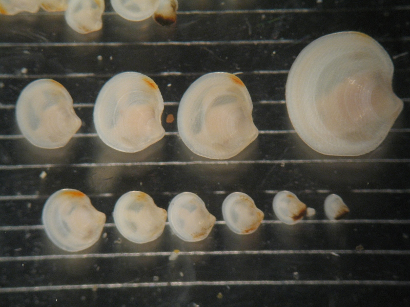 ...inserisco una foto di un piccolo esemplare, ma purtroppo con l'ingrandimento perdo in profondità di campo, e comunque al binoculare mi pare di non vedere strie oblique. Però, visto che nel campione che ho, gli esemplari un po' più grandi di quello fotografato sono tutti con striature oblique, può darsi che a questo stadio ancora non ci siano.... Ciao, Marco