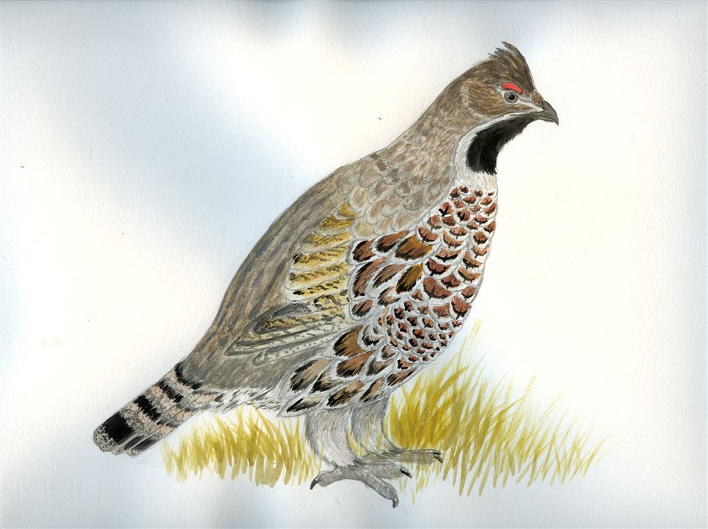 La 'pignolata' di questa volta è sulla coda: le timoniere centrali non hanno la fascia nera e sono più sul brunastro rispetto alle altre, che sono più grigie. Per il resto direi che se era la prima volta che dipingevi un Francolino di monte te la sei cavata bene (mi ripeto)!