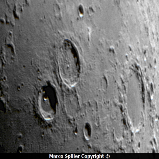 Ieri (ore 20.22), con la luna illuminata al 22% e ad un'altezza di 42° ho zoommato su alcuni crateri di Nord-Est. Da sinistra a destra Hercules, Atlas e Endymion.