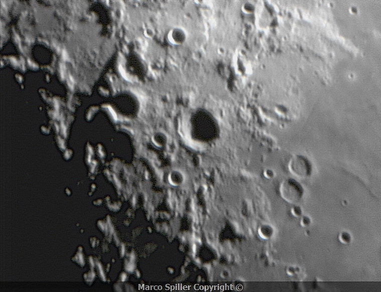In questa zona dalla superficie tormentata spiccano i crateri Delambre più a Nord e Taylor di dimensioni più ridotte e con dei craterini per così dire "accessori" più a sud ma in penombra. La foto nasce sempre da una ripresa del giorno 27.04.2012 alle ore 21.19.