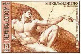 Il dipinto di Michelangelo della creazione di Adam è molto conosciuto. Ho trovato un francobollo della Russia di 1975: