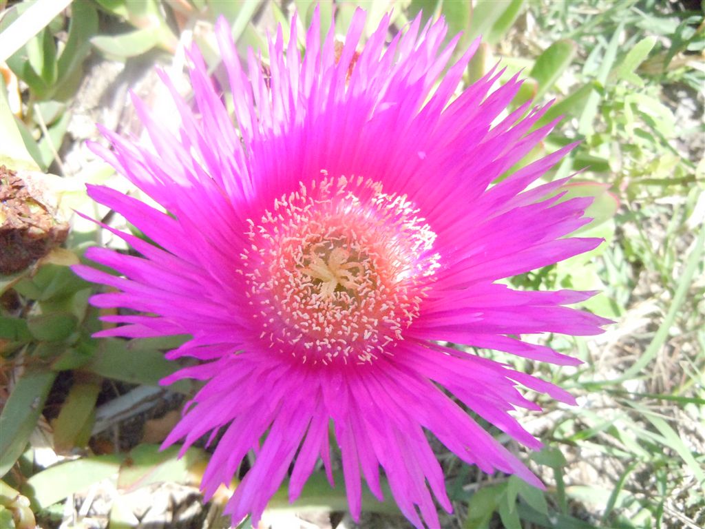Si tratta di Carpobrotus edulis, della famiglia delle Aizoaceae, detto "Fico degli Ottentotti" o, a volte, "Orecchie d'asino". È una pianta invasiva alloctona, di origine sudafricana, ormai diffusissima da noi insieme al suo parente, molto simile, C. acinaciformis.