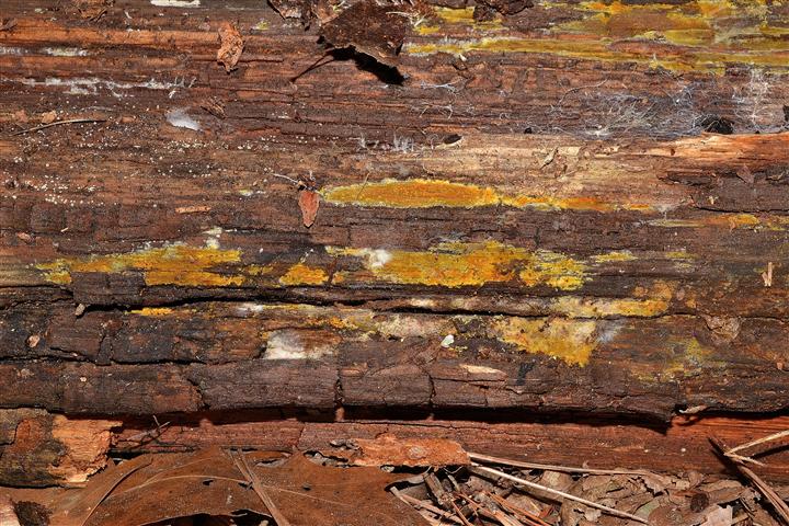 Potrebbe essere una Coniophora ma è necessaria la microscopia. Nella foto numero 6, attorno all'esemplare giallo ocraceo c'è una bella corticiacea che appare come dei puntini luminosi e argentei. Controlla anche quello. Se poi me li vuoi inviare, io sono pronta!